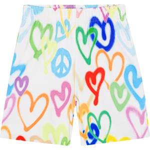 White shorts in organic cotton with a mulit-coloured all over heart print. The shorts are baggy, knee length and have side seam pockets and a single pocket on the back.