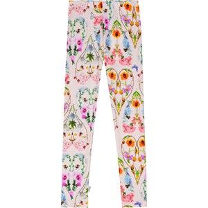 Off-white leggings in organic cotton. They are snug fitting, comfortable and easy to pull on. The leggings are in a multi-coloured, all over print of hearts that are formed by insects and wildflowers.