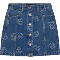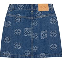 Denim skirt with woven clovers on a dark blue background. It has belt loops, a button front closure and pockets. The skirt has a beautiful fit with top stitched seams down from the pockets.