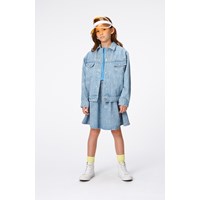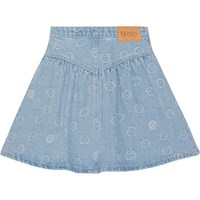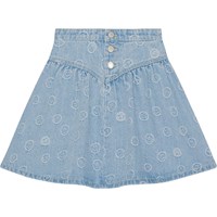 Mid-length, light coloured denim skirt with smiling faces woven into the fabric. The skirt is in an A-line shape and has a yoke with a button closure. It has elastic at the inside of the waist so it can be adjusted.