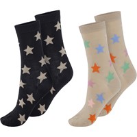 Two pairs of socks. One pair is in black with beige intarsia knit stars, and the other is in beige with multi-coloured stars.