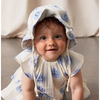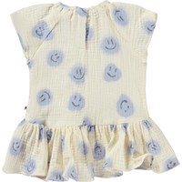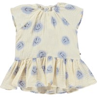 Carolina is a white baby dress, with blue smiling faces, in 100% cotton mousseline. Carolina has short raglan sleeves and a gathering effect at the neck. The dress has a low waist with a small, airy skirt and snap closure at the back.