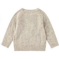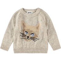 Beige melange knit sweater in soft wool blend for the little ones. The sweater features a round neckline with ribbed edge, raglan sleeves, and ribbing at the cuffs and waist. Additionally, there is a cute cat on the front.