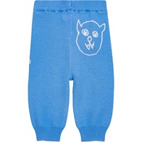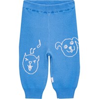 Soft, blue knit trousers in organic cotton. They have elastic with a drawstring at the waist and rib at the legs. They are comfortable and easy to pull on and move around in. The trousers have an intarsia outline of a dog and a singing cat. This style can be purchased with the matching cardigan for a complete set.