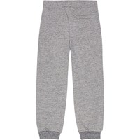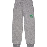 Grey melange sweatpants with an unbrushed interior, which makes it pleasantly cool on a hot day. The trousers have an elastic waistband with an internal drawstring, ribbed cuffs at the ankles, side pockets, and a back pocket. The trousers have a regular fit and a printed green text spiral on the thigh.