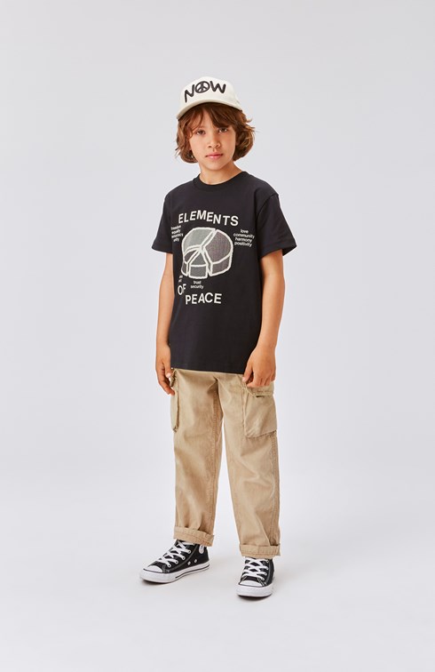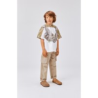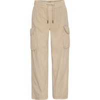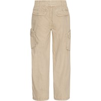 Argo is a pair of beige cargo trousers with large, patch pockets at the sides of the legs. The trousers have two back pockets with flaps as well as elastic with ties at the waist to make sure the trousers stay in place.