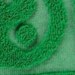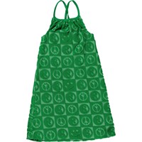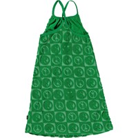 Green terry dress in a soft cotton blend with a checker pattern. The pattern is made up of happy emojis, yin/yang symbols and peace signs. The dress is knee length and has straps that cross on the back. The soft terry quality and the loose fit make this dress ideal to wear at the beach or pool.