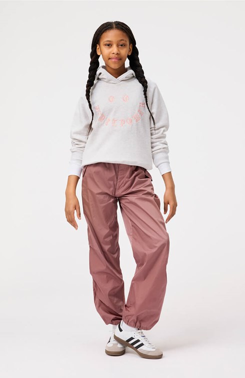 Dark pink pants made of nylon. These pants have an elastic drawstring closure at the waist, as well as elastic at the ankles, giving them a cool and sporty look. It also has side pockets with button closure and a single back pocket.