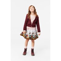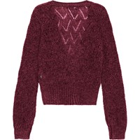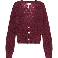 Bordeaux knitted cardigan with a hole pattern in a soft wool blend. Deep neckline, button closure, and long sleeves with volume and ribbed cuffs. Wide ribbed hem at the hips for a comfortable fit. It's perfect as an extra layer on cold days or over a dress for a cute look.
