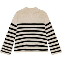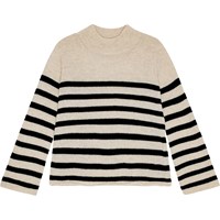 Beige and black striped knitted jumper in soft wool. The jumper has long trumpet-shaped sleeves, a loose fit, and a round neckline with ribbed trim. There are raw edges on the sleeves and at the bottom, as well as low shoulder seams. The jumper is soft and warm, perfect for colder days.