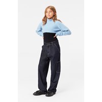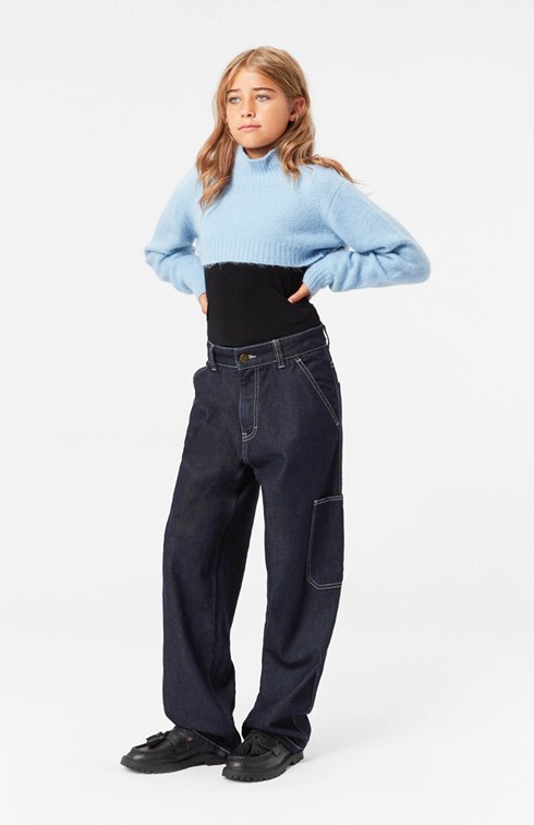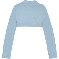 This light blue bolero is made from a soft wool blend. It has long sleeves, a high neck, and ribbed edges on the sleeves, neck, and bottom of the blouse. The bolero is both warm and comfortable to wear, and it adds something unique to your wardrobe.