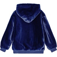 Exclusive, dark blue faux fur hoodie with a round neck and ribbed cuffs, neckline, and waist. It's soft, warm, and loose fit, making it perfect for layering with a long-sleeved T-shirt on cold days.
