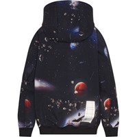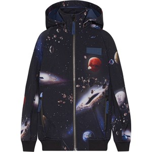 Dark softshell jacket with an allover print of planets, distant galaxies, and satellites. The jacket is made from a windproof and water-repellent material with a water column pressure of up to 5,000 mm, capable of withstanding sudden rain showers. It offers excellent air circulation, keeping moisture at bay with breathability of up to 5,000 g/m2/24h. The jacket features a detachable hood, elastic waist, stand-up collar, and a zipper with a chin guard to prevent friction against the skin. Side pockets, wind cuffs in the sleeves, and elastic edges at the bottom and wrists. A water and dirt-repellent coating has been applied, without the use of chemicals like PFOS, PFOA, and similar substances.