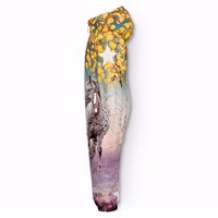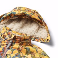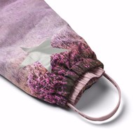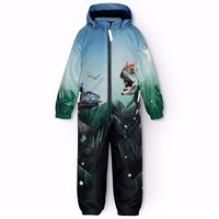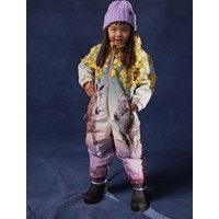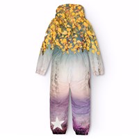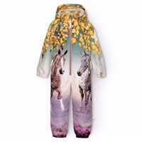 Snowsuit in recycled polyester for a cold winter with a print of horses on a beautiful purple forest floor between large oak trees with yellow leaves in blue and purple shades. The snowsuit has a detachable lined hood and zippers with flaps that keep wind and water out. There is elastic at the waist, sleeves, and leg openings to keep snow, rain, and wind out. The snowsuit has reflectors along the side seams and around the hood, as well as large star-shaped reflectors on both the sleeves and legs to increase visibility in traffic. Features: Windproof, waterproof, and breathable. Water column pressure: 15,000 mm. Breathability: 15,000 g/m2/24h. Waterproof seams. PFC-free (PFOS and PFOA). Reflective edges and reflectors on legs and arms to increase visibility in traffic. Detachable hood. Internal fleece lining at knees, bottom, and back for extra insulation in vulnerable areas. Snow gaiter at leg opening and detachable rubber boot strap. Fleece lining in pockets.