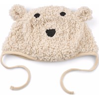 Off-white bonnet with teddy bear ears for the little ones. The bonnet is made of soft teddy fleece and is perfect for keeping the head and ears warm on cold days. The bonnet can be tied tightly to the face with a string under the chin.