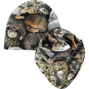 Baby hat and bib with a print of various animals that are hibernating. The bib has a single snap clousre at the neck.