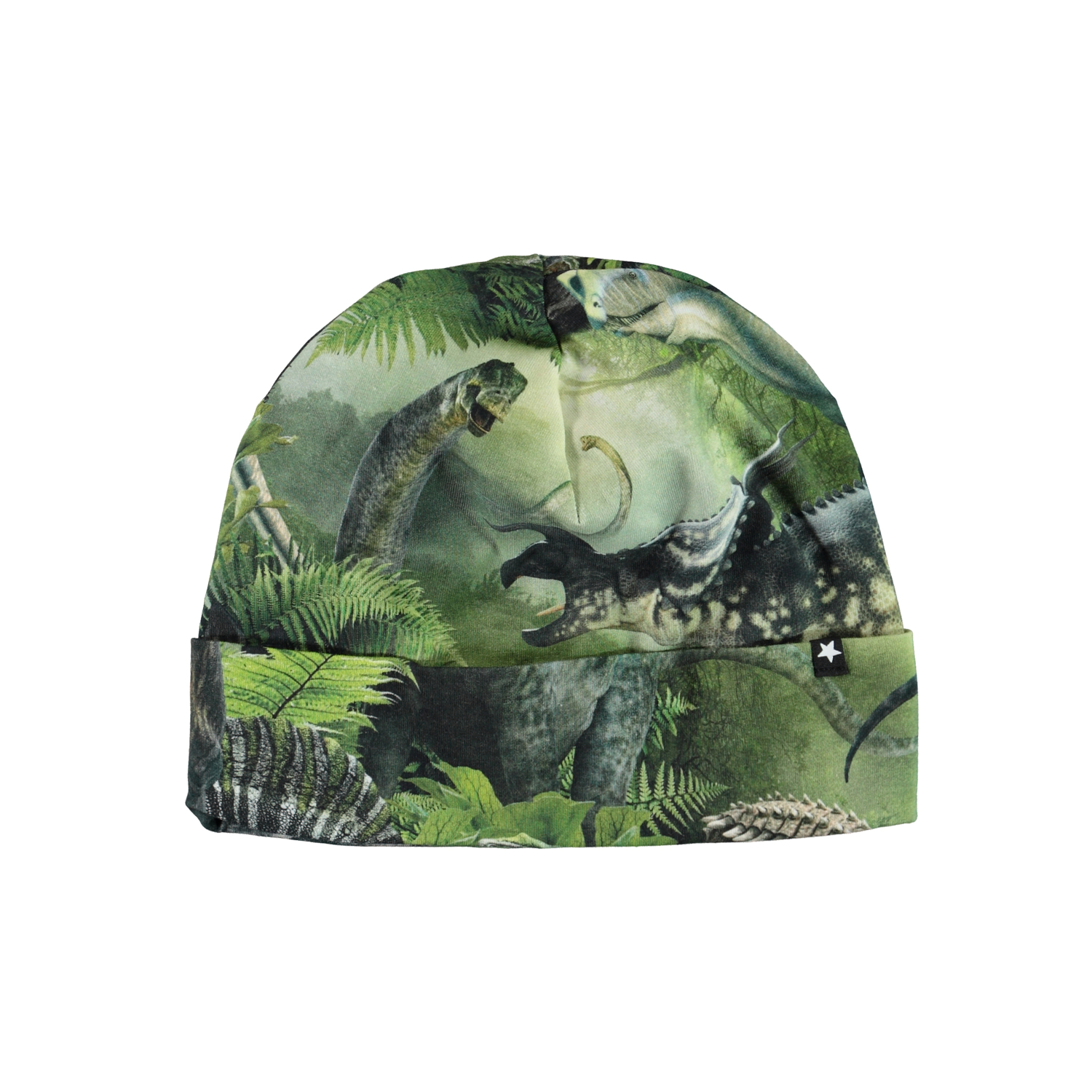 Soft, elastic hat in a double layer. It is in green with a print of a dinosaur. The hat can be used rolled up or down.