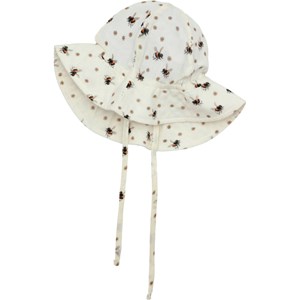 Sun hat in lightweight, organic cotton weave with wavy brim and chin ties. The hat is in an all over print of small flowers with humming bumble bees flying around.