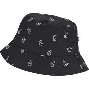 Bucket hat in black with a print of various small hand signs. The hat has a wide brim.