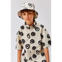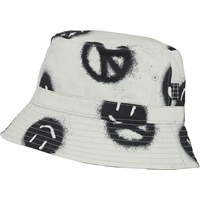 Siks is an off-white bucket hat in Peace Smile, an all over print. The print looks like someone has spray painted tags of a big peace sign and smiley faces.
