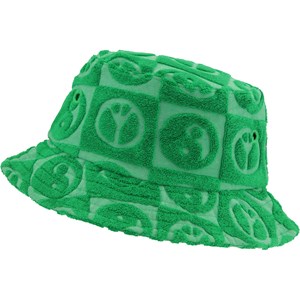Green terry bucket hat in a soft cotton blend with a checker pattern. The pattern is made up of happy emojis, yin/yang symbols and peace signs. This hat creates the perfect shade in the summer sun.