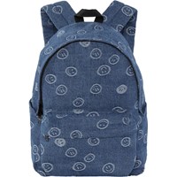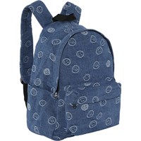 Backpack in blue denim with small smiley faces. It is spacious and offers plenty of room, including a padded compartment to protect your laptop or tablet. Additionally, it features a zippered front pocket, bottle pockets on both sides and padded back and shoulder straps. It also has an adjustable chest strap that helps evenly distribute the weight. Dimensions: 30 x 17 x 42. Volume: 21L.