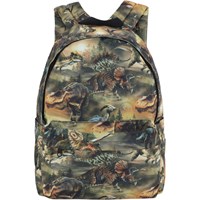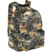 Backpack with a print of dinosaurs. The backpack has plenty of space for books, binders, pencil case, lunch box and a padded sleeve that can fit a laptop or tablet. It has a front zip pocket for easy access, bottle pockets on both sides, padded back and shoulder straps, and an adjustable chest strap that helps distribute the weight evenly. Dimensions: 30 x 17 x 42. Volume: 21L.