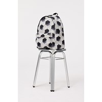 Black and white backpack with football print. It is spacious and offers plenty of room, including a padded compartment to protect your laptop or tablet. Additionally, it features a zippered front pocket, bottle pockets on both sides and padded back and shoulder straps. It also has an adjustable chest strap that helps evenly distribute the weight. Dimensions: 30 x 17 x 42. Volume: 21L.