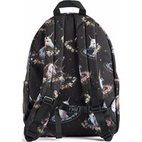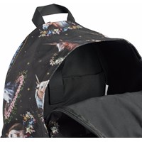 Black backpack with a unicorn and flower print. The backpack has plenty of storage space, including a padded pocket that protects your computer or tablet. It features a zippered front pocket, bottle pockets on both sides, and padded back and shoulder straps. Additionally, it has an adjustable chest strap that helps evenly distribute the weight The backpack measures 30 x 17 x 42 cm and has a volume of 21L.