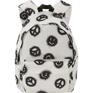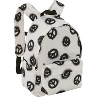 Backpack in off-white with a print of peace signs and smiley faces. It is spacious and offers plenty of room, including a padded compartment to protect your laptop or tablet. Additionally, it features a zippered front pocket, bottle pockets on both sides and padded back and shoulder straps. It also has an adjustable chest strap that helps evenly distribute the weight. Dimensions: 30 x 17 x 42. Volume: 21L.