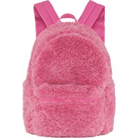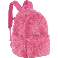 Pink backpack in soft faux fur. The backpack has plenty of space for books, binders, pencil case, lunch box and a padded sleeve that can fit a laptop or tablet. It has a front zip pocket for easy access, bottle pockets on both sides, padded back and shoulder straps, and an adjustable chest strap that helps distribute the weight evenly. Dimensions: 30 x 17 x 42. Volume: 21L.