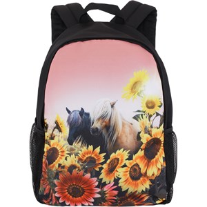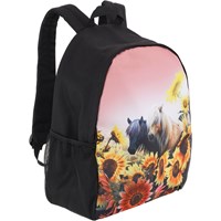 Black backpack with a pink front and a print of horses in a sunflower field. This backpack has plenty of space for your books, binders, pencil case, lunch box and a padded sleeve that can fit a laptop or tablet. The backpack has bottle pockets on both sides, padded back and shoulder straps, and an adjustable chest strap that helps distribute the weight evenly. Dimensions: 30 x 17 x 42. Volume: 21L.