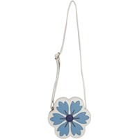White crossbody bag with a sweet floral motif in blue on the front. It has an adjustable shoulder strap.