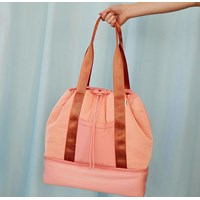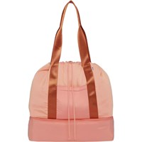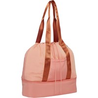 A cool and practical sports bag that's roomy enough for all sorts of things. There's even a separate, zippered compartment at the bottom for shoes and another zippered compartment on the inside. The bag has a spot for a water bottle, too. It has wide, comfortable straps in orange, and has a cool mesh layer as well as a small pocket on the front. The bag has a tie closure.