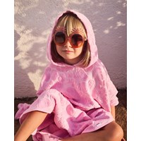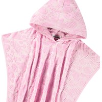 Pink hooded bath poncho in soft cotton terry with a pattern of exotic fruits. The poncho is knee-length and open at the sides, allowing for easy movement. It also features a fixed hood with a large opening, making it easy to put on and take off.