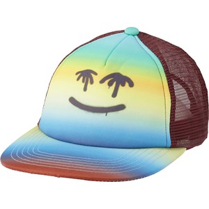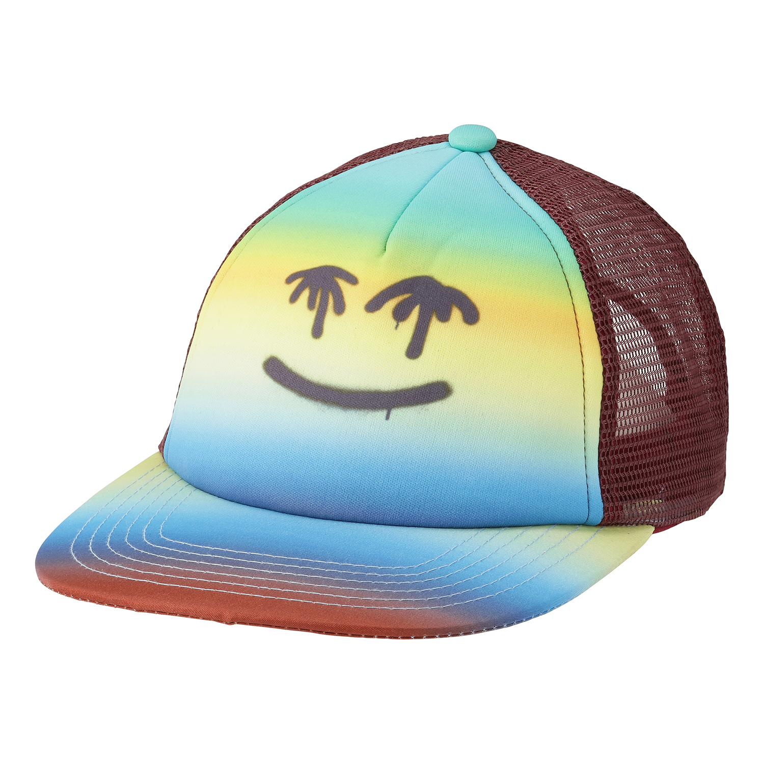 Cool, multi-coloured cap with a emoji palm tree print in black. The cap has brown mesh on the back and is adjustable at the back.