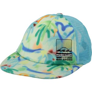Cool cap in green and turquoise with a spray painted palm tree print in various colours. The cap has turquoise mesh on the back and is adjustable at the back.