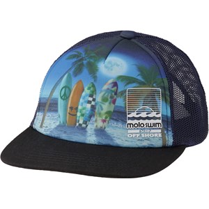 Cool, black cap with a surfboard print in shades of blue. The cap has black mesh on the back and is adjustable at the back.