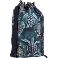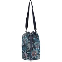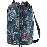 Large bag with a turtle print. The bag is water repellent and has a tie closure at the top that can be cinched. It also has a shoulder strap. The bag is perfect for a trip to the beach.