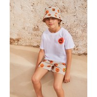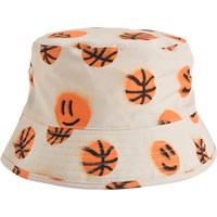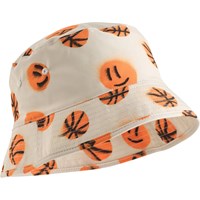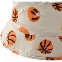 Beige bucket hat with orange basketball print, made of recycled nylon with UV protection 50+. It has a regular fit, ventilation holes to increase breathability, and is made of a quick-drying material, making it suitable for the beach and pool.
