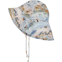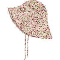 Sun hat with 50+ UV protection, a wide brim and longer on the back to best protect a child. The sun hat is in a rose colour with a print of different coloured smiley faces.