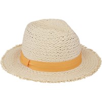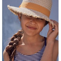Light coloured straw hat with a yellow ribbon. The hat protects against the sun's rays and is perfect for a trip to the beach.