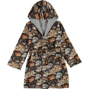 Wave is a soft bathrobe with a print of animals that are hibernating. It's lined in a lightweight, tightly woven terry cloth and has two pockets, ties at the waist, and it has a large hood to keep the head and neck extra warm.