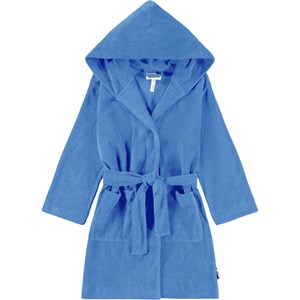 Blue bathrobe made of super soft, organic cotton terry. The bathrobe has two pockets, a waist tie, and a hood.