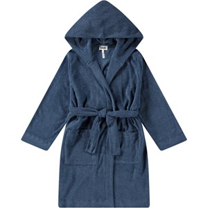 Dark blue dressing gown made of super soft, organic cotton terry. The dressing gown has two pockets, a waist tie, and a hood.