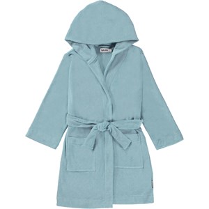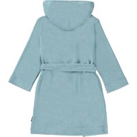 Wonderfully soft dressing gown in a lightweight, tightly woven, light blue terry quality. It has two pockets, ties at the waist and has a large hood to keep the neck and head extra warm.