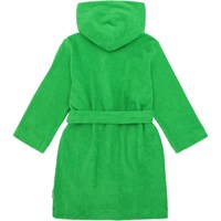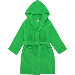 Green dressing gown in super soft organic cotton terry. It has two pockets, a waist sash and a hood.