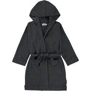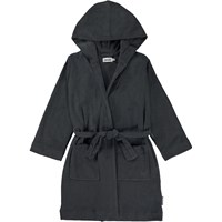Wonderfully soft dressing gown in a lightweight, tightly woven, dark blue terry quality. It has two pockets, ties at the waist and has a large hood to keep the neck and head extra warm.