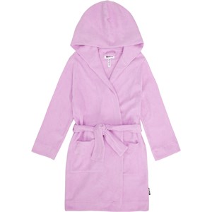Pink dressing gown made from super soft, organic cotton terry. The dressing gown has two pockets, a waist tie, and a hood.