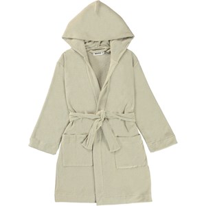 Wyn is a wonderfully soft bathrobe in a lightweight, tightly woven terry cloth in a beige. It has two pockets, ties at the waist and a hood to keep the head and neck warm.